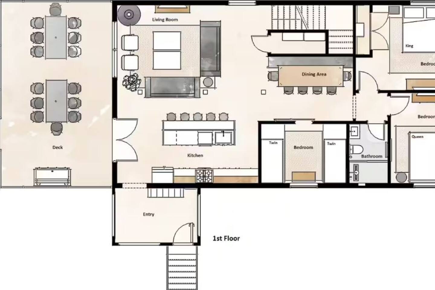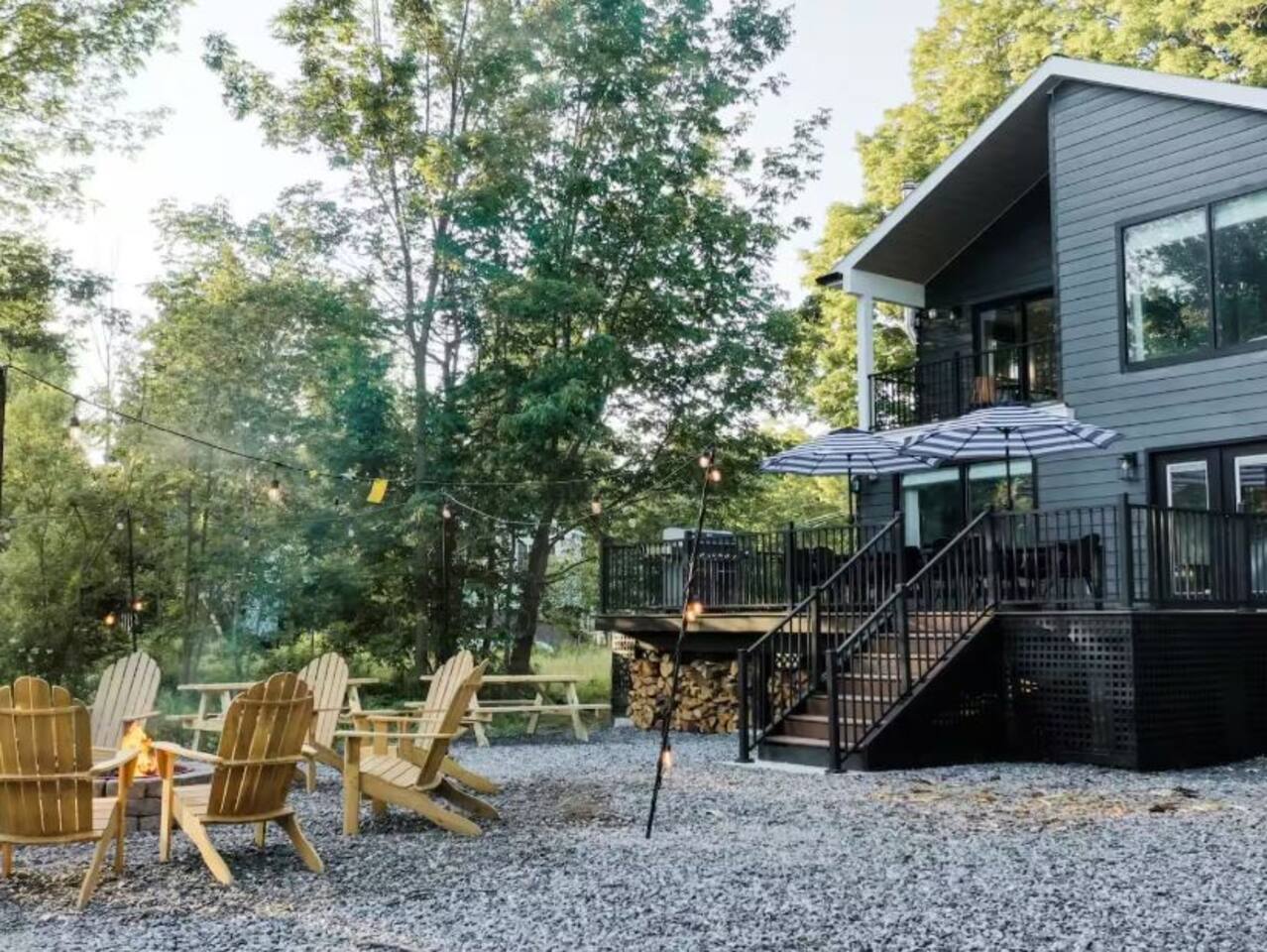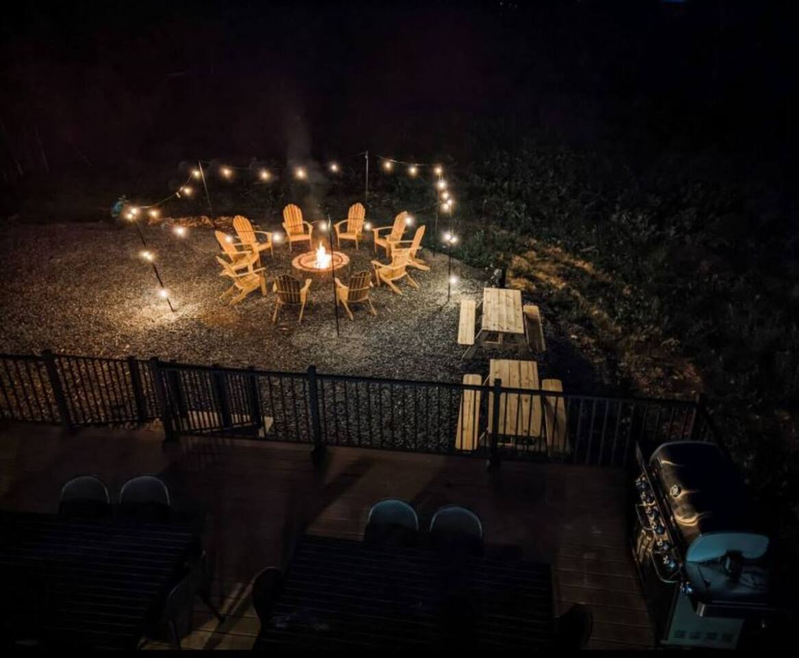 Guest can enjoy the privacy of the entire house, private deck, fire pit and seating areas around the yard including the lake