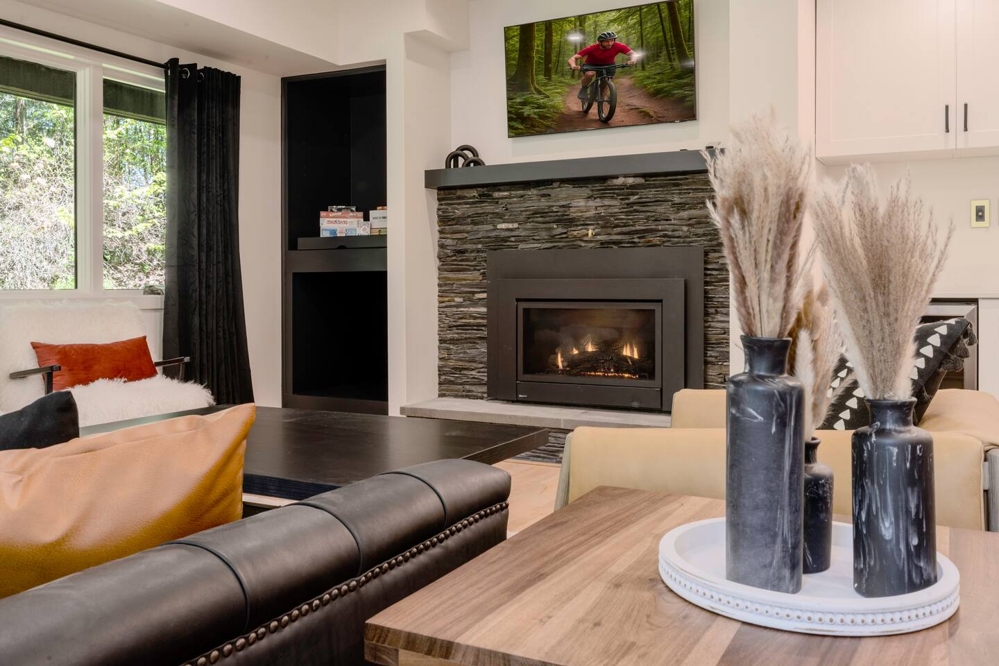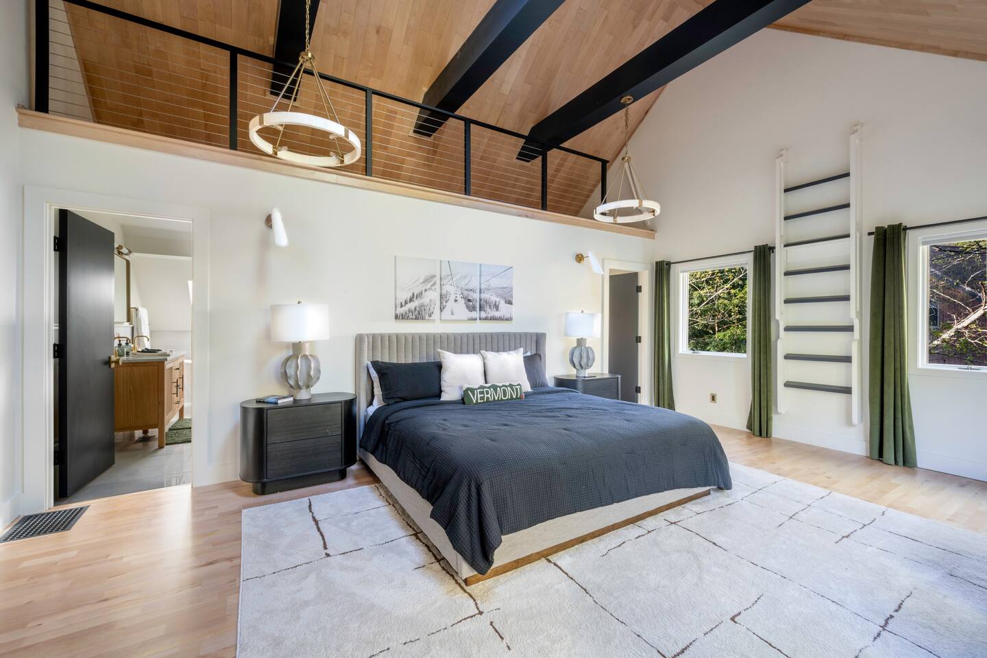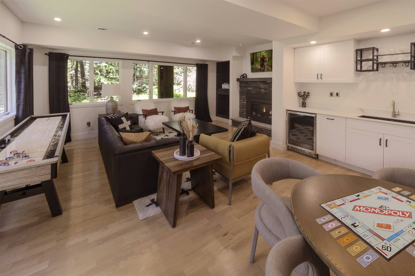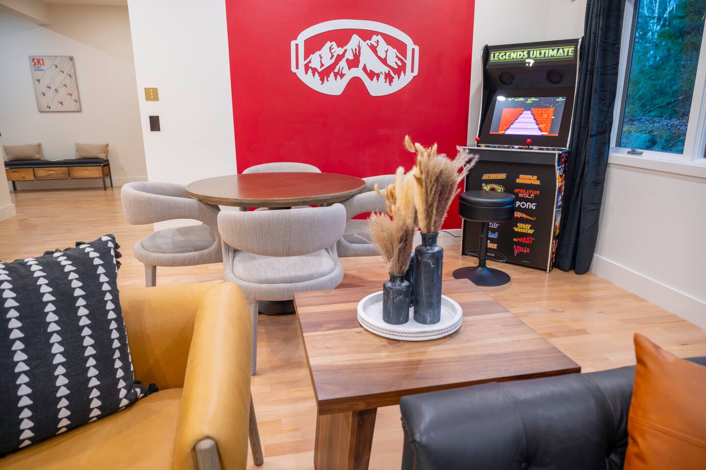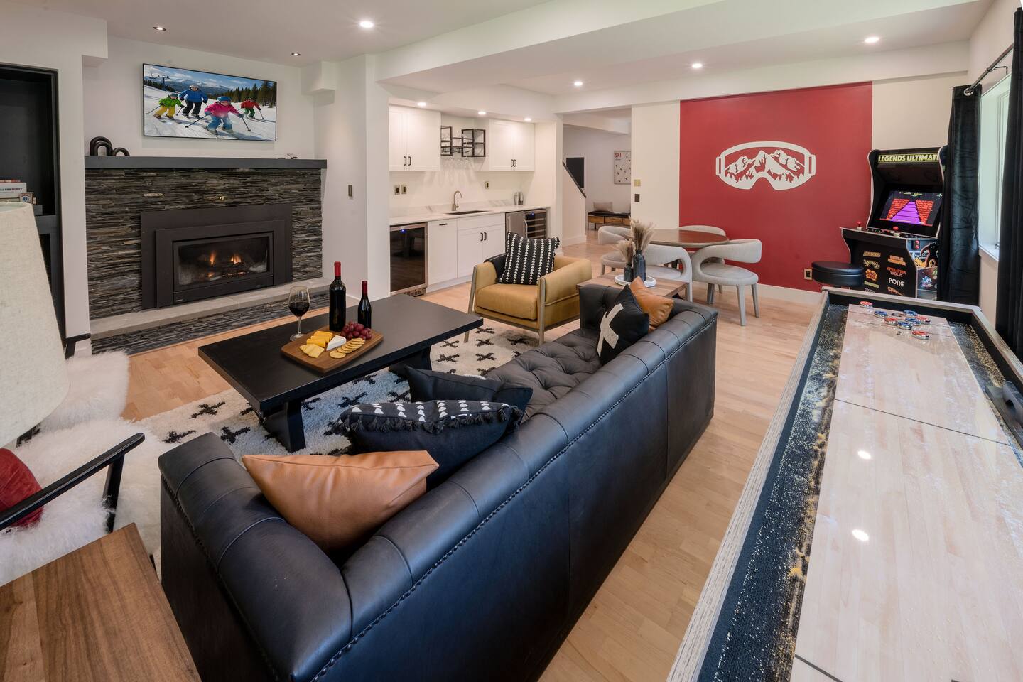 Stowecation is a perfect place to gather with friends or family with 5 bedrooms and amazing views off of the large decks! Test your skills on the shuffleboard table and Arcade or simply relax in the hot tub and sauna! The choice is yours Stowecation has it all! Perfect location just minutes to the mountain and to town. Come stay in the largest and most luxurious unit in the Stonybrook community! Direct access to the Stowe rec path and Cady Hill mountain bike trail system. Short walk to the famous Alchemist brewery, restaurants and shops. FEATURES * 4,100 Sqft with 5 Bedrooms * Hot Tub * Sauna * Game Room * EV Car Charger * Outside Dining * BBQ Grill * 6 Bathrooms * Pull out sofa bed * 4 Fireplaces (2 wood burning) * Sub Zero Refrigerator * Wolf Stove and Microwave * Miele built in coffee machine * Sub Zero Wine Cooler * Built in Ice Machine * Heated Bathroom Floors * Washer/Dryer * Central AC * Wet Bar * Large Spacious Decks * Resort Pools/Tennis Courts/Gym/Sauna * High Speed Wi-Fi * Dedicated Work Space * Fully Stocked Luxurious Kitchen and Spacious Dining Room FIVE BEDROOMS & SIX BATHROOMS * Bedroom 1 : King bed master suite w/TV on 2nd level with walk in closet and large tiled shower with separate soaking tub * Bedroom 2 : Queen bedroom suite w/TV on 1st floor with sitting area and master bath tiled shower * Bedroom 3 : Queen bedroom w/TV on 2nd floor with sitting area and shared full bath * Bedroom 4 : King bedroom w/TV on 2nd floor with shared full bath * Bedroom 5 : King bedroom and Queen bunk beds w/TV on ground floor with sitting area and large master bath with tiled shower and soaking tub * Pull out sofa bed in the library/office FAMILY AMENITIES * Washer & dryer laundry on ground floor * High chair * Pack n play (sheet not included) * Baby dinnerware LIVING ROOM * Open concept with luxurious soft and comfy couches and chairs. Wood burning fireplace with large smart TV OFFICE * Cozy area with a work station and wood burning fireplace KITCHEN * Fully equipped * Island bar seating for four * Coffee station with drip and Keurig machine * Miele custom built in coffee machine * Top of the line appliances - Sub Zero, Wolf, Miele DINING * Seats a total of 8 people at the table plus 4 more at the island bar GROUND FLOOR GAME ROOM/BAR AREA * Gas fireplace * Arcade machine 2 player * Shuffleboard * Connect 4 wall mounted * TV * Seating areas * Wet bar with icemaker and mini fridge * Wine fridge * Round table with board games Exterior * EV universal car charger * Hot tub 8 person * Dining table 8 person * Sauna infrared 4 person * Couch and tables * BBQ grill propane * Seating area in front deck with rocking chairs * String lights DISTANCE TO ATTRACTIONS * Stowe Mountain Resort 4 miles * Stowe Rec Path under 1 mile * Alchemist Brewery 1 mile * Von Trapp Brewery 2 miles * Piecasso Pizza 1.5 miles * Idletyme Brewery 1.5 miles * Ben and Jerry's Factory Facility 10 miles