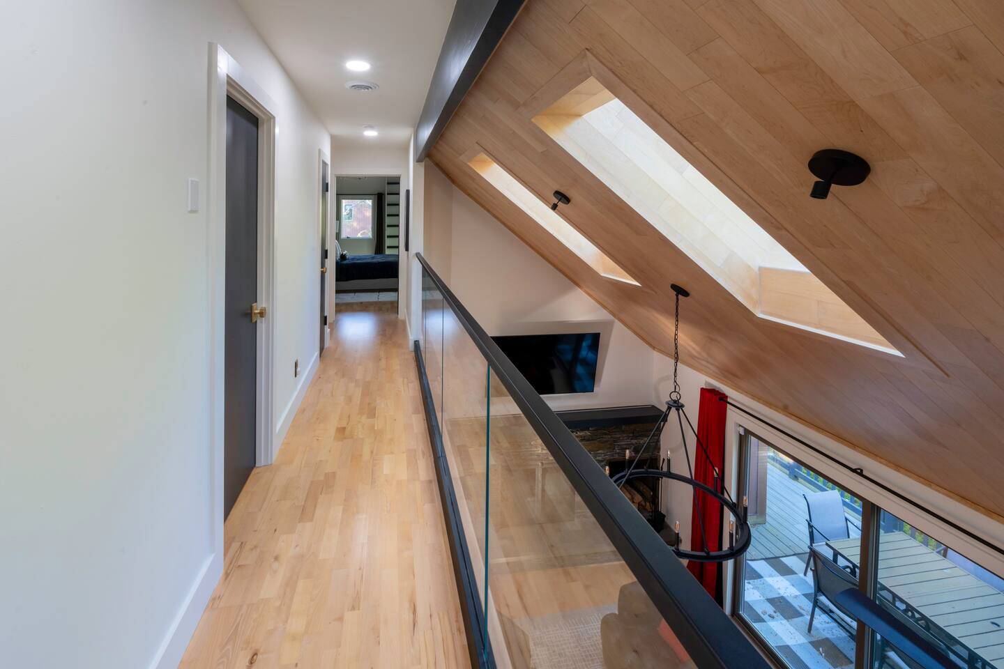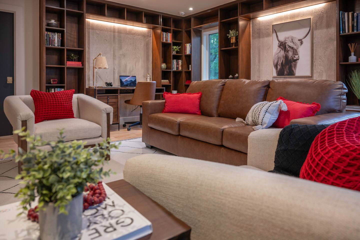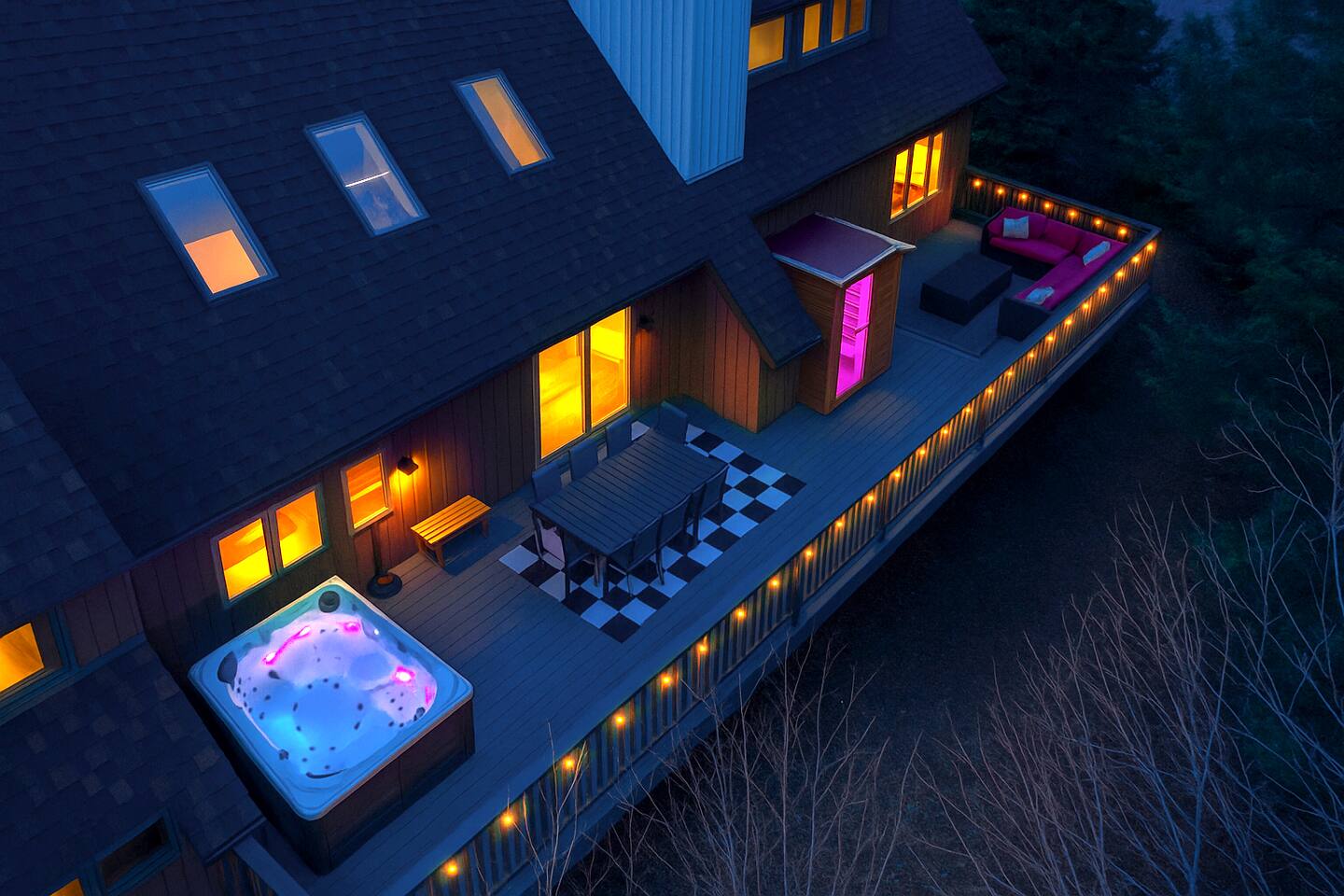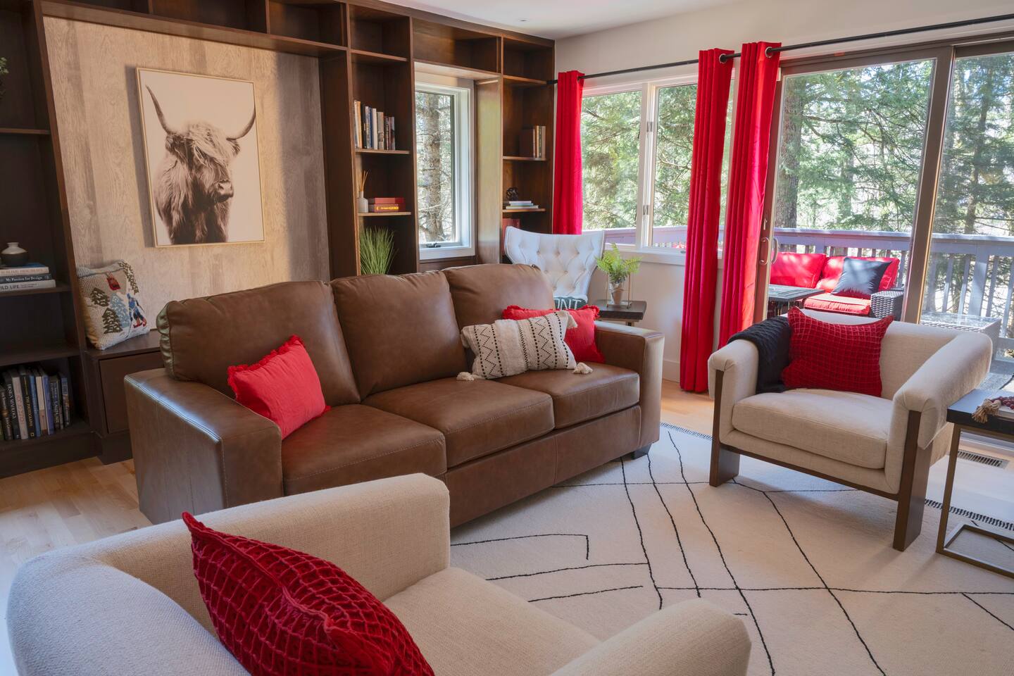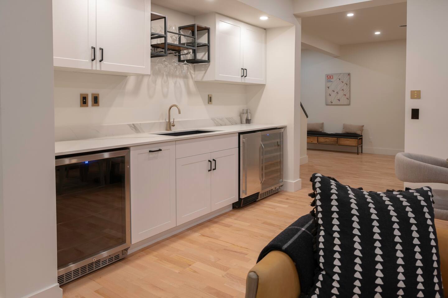 Stowecation is a perfect place to gather with friends or family with 5 bedrooms and amazing views off of the large decks! Test your skills on the shuffleboard table and Arcade or simply relax in the hot tub and sauna! The choice is yours Stowecation has it all! Perfect location just minutes to the mountain and to town. Come stay in the largest and most luxurious unit in the Stonybrook community! Direct access to the Stowe rec path and Cady Hill mountain bike trail system. Short walk to the famous Alchemist brewery, restaurants and shops. FEATURES * 4,100 Sqft with 5 Bedrooms * Hot Tub * Sauna * Game Room * EV Car Charger * Outside Dining * BBQ Grill * 6 Bathrooms * Pull out sofa bed * 4 Fireplaces (2 wood burning) * Sub Zero Refrigerator * Wolf Stove and Microwave * Miele built in coffee machine * Sub Zero Wine Cooler * Built in Ice Machine * Heated Bathroom Floors * Washer/Dryer * Central AC * Wet Bar * Large Spacious Decks * Resort Pools/Tennis Courts/Gym/Sauna * High Speed Wi-Fi * Dedicated Work Space * Fully Stocked Luxurious Kitchen and Spacious Dining Room FIVE BEDROOMS & SIX BATHROOMS * Bedroom 1 : King bed master suite w/TV on 2nd level with walk in closet and large tiled shower with separate soaking tub * Bedroom 2 : Queen bedroom suite w/TV on 1st floor with sitting area and master bath tiled shower * Bedroom 3 : Queen bedroom w/TV on 2nd floor with sitting area and shared full bath * Bedroom 4 : King bedroom w/TV on 2nd floor with shared full bath * Bedroom 5 : King bedroom and Queen bunk beds w/TV on ground floor with sitting area and large master bath with tiled shower and soaking tub * Pull out sofa bed in the library/office FAMILY AMENITIES * Washer & dryer laundry on ground floor * High chair * Pack n play (sheet not included) * Baby dinnerware LIVING ROOM * Open concept with luxurious soft and comfy couches and chairs. Wood burning fireplace with large smart TV OFFICE * Cozy area with a work station and wood burning fireplace KITCHEN * Fully equipped * Island bar seating for four * Coffee station with drip and Keurig machine * Miele custom built in coffee machine * Top of the line appliances - Sub Zero, Wolf, Miele DINING * Seats a total of 8 people at the table plus 4 more at the island bar GROUND FLOOR GAME ROOM/BAR AREA * Gas fireplace * Arcade machine 2 player * Shuffleboard * Connect 4 wall mounted * TV * Seating areas * Wet bar with icemaker and mini fridge * Wine fridge * Round table with board games Exterior * EV universal car charger * Hot tub 8 person * Dining table 8 person * Sauna infrared 4 person * Couch and tables * BBQ grill propane * Seating area in front deck with rocking chairs * String lights DISTANCE TO ATTRACTIONS * Stowe Mountain Resort 4 miles * Stowe Rec Path under 1 mile * Alchemist Brewery 1 mile * Von Trapp Brewery 2 miles * Piecasso Pizza 1.5 miles * Idletyme Brewery 1.5 miles * Ben and Jerry's Factory Facility 10 miles